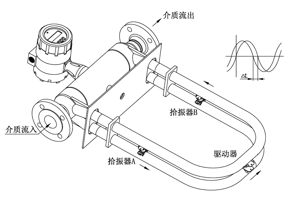SYZLL系列質(zhì)量流量計(jì)(以下簡(jiǎn)稱(chēng)流量計(jì))的結(jié)構(gòu)是雙彎U形管結(jié)構(gòu),其測(cè)量原理是:測(cè)量作用于雙彎管上的科里奧利力(簡(jiǎn)稱(chēng)科氏力)所產(chǎn)生的相位差來(lái)檢測(cè)管道中的質(zhì)量流量。