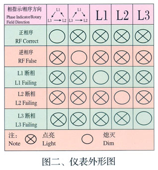 當接通電源后,各相所對應的指示燈點亮;如有缺相時對應此相的指示燈會熄滅,且正序與逆序指示燈同時點亮。